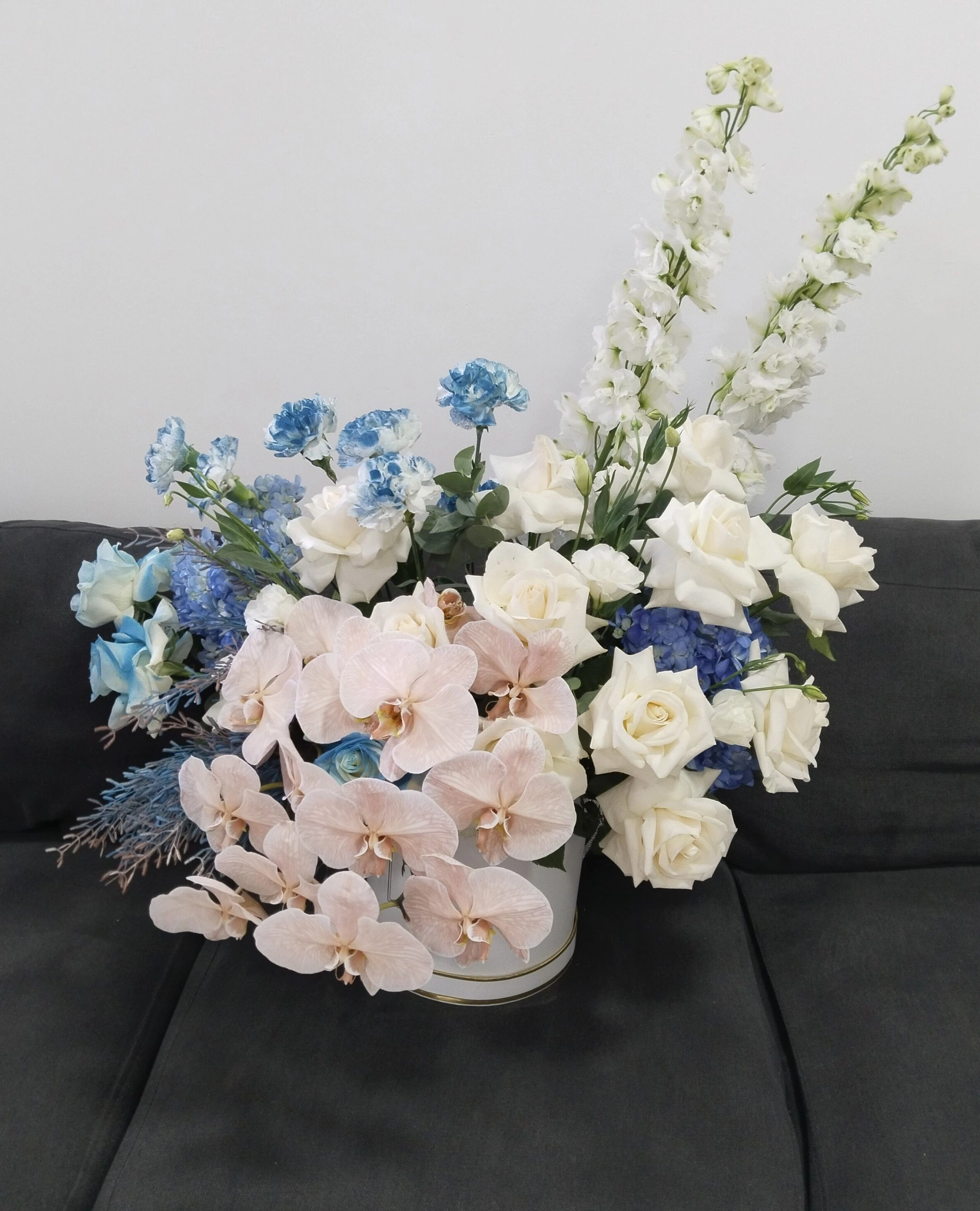 This stunning blue and white floral arrangement combines the elegance of white roses, delicate blue carnations, and lush pink orchids, arranged with tall white delphiniums. Perfect for weddings, anniversaries, or any special occasion, this luxurious flower arrangement brings a touch of sophistication and tranquility to any setting. Order now from Global Designs Flower to add timeless beauty to your celebrations.