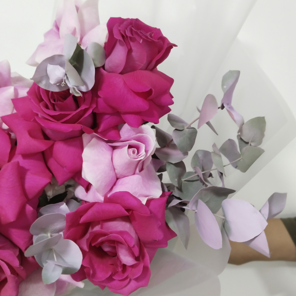 Dark Pink Light Pink Rose Bouquet – A harmonious blend of deep magenta and blush roses, kissed by eucalyptus and baby’s breath. Designed for Dubai’s nuanced romantics, this bouquet is perfect for anniversaries, proposals, or “I cherish you” moments.